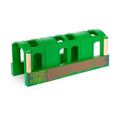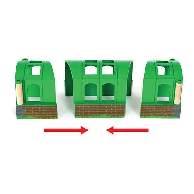 Vielseitiges, dreiteiliges Tunnelset. Die Teile können hintereinander oder einzeln aufgestellt werden, bilden dadurch unterschiedliche Schienenverläufe und passen perfekt zu den Zügen und Schienen von BRIO.