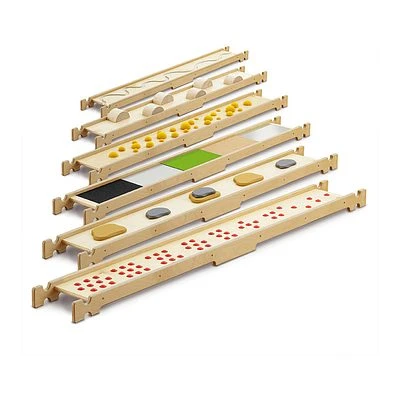 - Set aus 6 Balancierbrettern: 46380 Flusslauf, 46381 Äste, 46382 Waldboden, 46383 Materialmix, 46384 Feldsteine, 46385 ZEHner Schritt