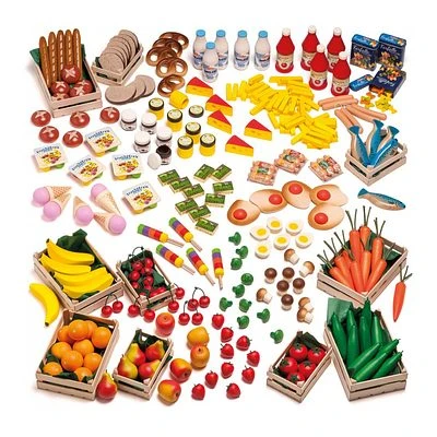 Von Obst und Gemüse über Süßes und Herzhaftes bis hin zu Kaltem und Heißem ist alles – auch nötiges Zubehör – in dieser Kaufladensortierung dabei. - Mit dem Kaufladenzubehör von Erzi wird gemeinsames Spielen und Kreativität gefördert.