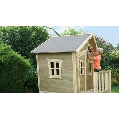 Das EXIT Crooky 300 ist ein fantastisches und echt cooles Häuschen! Hier kannst du zusammen mit deinen Geschwistern oder Freunden und Freundinnen nach Herzenslust spielen. Mit seiner natürlichen Farbgebung, den asymmetrischen Fenstern und der Tür sieht dieses Spielhaus aus wie eine selbst gebaute Blockhütte! Die Kreidetafel an der Vorderseite des EXIT Crooky macht deine coole Baumhütte komplett! Das erhöht auf Stelzen stehende Häuschen hat eine echte Veranda, und über die Rutsche bist du schnell wieder unten! Die Innenmaße des EXIT Crooky reichen von 110,5 x 110,5 cm am Boden bis zu 138 x 110,5 an der breitesten Stelle. Dadurch bietet das Häuschen ausreichend Platz zum Spielen für mehrere Kindern.
