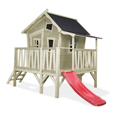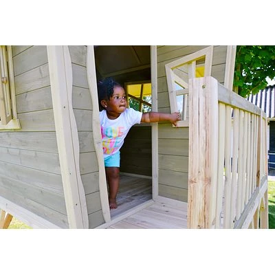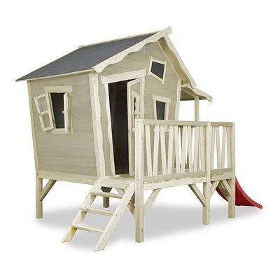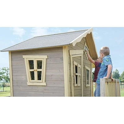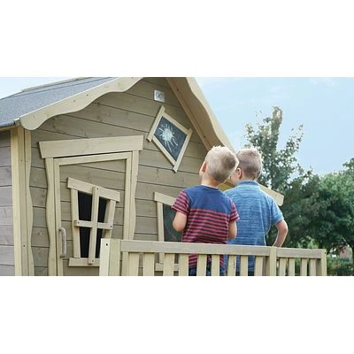 Das EXIT Crooky 350 ist ein fantastisches und echt cooles Häuschen! Hier kannst du zusammen mit deinen Geschwistern oder Freunden und Freundinnen nach Herzenslust spielen. Mit seiner natürlichen Farbgebung, den asymmetrischen Fenstern und der Tür sieht dieses Spielhaus aus wie eine selbst gebaute Blockhütte! Das erhöht aufgestellte Spielhaus hat eine echte Veranda, die sowohl links als auch rechts montiert werden kann. Dort können die Kids vor brennender Sonne und Regen geschützt ungestört weiterspielen! Die Kreidetafel an der Vorderseite des EXIT Crooky und die coole Rutsche machen deine Baumhütte komplett! Die Innenmaße des EXIT Crooky reichen von 110,5 x 110,5 cm am Boden bis zu 138 x 110,5 an der breitesten Stelle. Dadurch bietet das Häuschen ausreichend Platz zum Spielen für mehrere Kindern.
