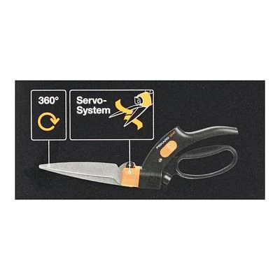 Das Servo-System von Fiskars sorgt für saubere Schnitte, ohne dass die Klingen beim Schneiden verkleben. Der Schneidewinkel des Scherenkopfes lässt sich innerhalb von 360 Grad drehen und ist somit flexibel einstellbar.