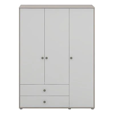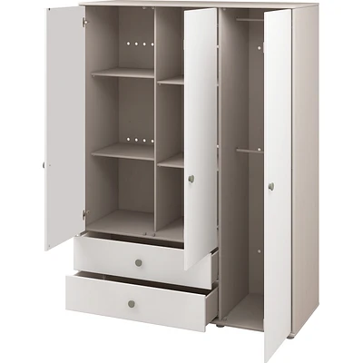 - Der FLEXA Classic Kleiderschrank hat 3 Türen, 2 Schubladen, 4 Regalböden, 2 Kleiderstangen und Füße.