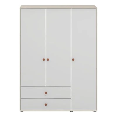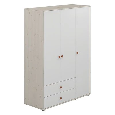 - Der FLEXA Classic Kleiderschrank hat 3 Türen, 2 Schubladen, 4 Regalböden, 2 Kleiderstangen und Füße.