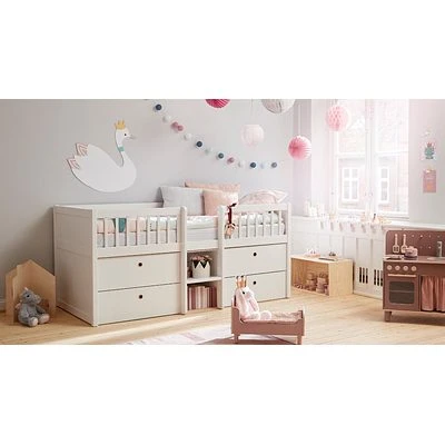 Die Kollektion FREJA besticht durch ein elegantes Design mit integrierten Aufbewahrungslösungen. Die Kollektion umfasst ein halbhohes Bett mit integrierter Aufbewahrungslösung, einer schönen Absturzsicherung und einer kleinen Leiter. Das Bett eignet sich gleichermaßen perfekt zum Schlafen wie zum Spielen. Das elegante Design macht es zu einer hochwertigen Lösung fürs Kinderzimmer.