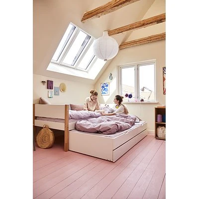 - Das Bett ist leicht erhöht, damit das Ausziehbett und die Schubladen darunter passen. Durch das Auziehbett hat der Besuch immer einen Schlafplatz und die Schubladen liefern zusätzlichen Stauraum für z.B. Bettwäsche.