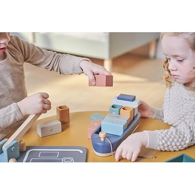 Das Containerschiff aus Holz bereichert das fantasievolle Spielen Ihres Kindes und fördert gleichzeitig seine Feinmotorik und das räumliche Vorstellungsvermögen. Ihr Kind kann fünf Container auf das riesige Schiff laden und so tun, als würde es mit seiner kostbaren Fracht in die weite Ferne segeln. Die Schiffscontainer und Wertstofftonnen können mit einem Magneten be- und entladen werden. Die Kombination aus dem Containerschiff mit unserem LKW und Kran-Set hilft Ihrem Kind, das Konzept der Infrastruktur und den Unterschied zwischen Land- und Seereisen zu verstehen.