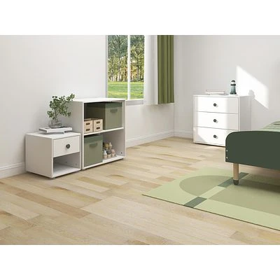 Die freistehende Roomie Kommode hat eine Schublade mit einem abgerundeten Holzknauf in verschiedenen Farbvariationen. Die Kommode hat ein zeitloses skandinavisches Design mit glatten Kanten und Schubladenführungen mit Soft-Close-Funktion, damit kleine Finger beim Öffnen und Schließen der Schublade nicht eingeklemmt werden.