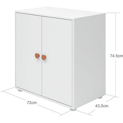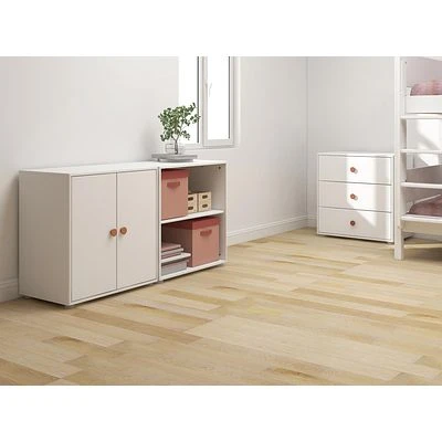 Die Kommode hat ein zeitloses skandinavisches Design mit glatten Kanten und Soft-Close-Funktion, damit kleine Finger beim Öffnen und Schließen der Türen nicht eingeklemmt werden. Sie passt unter halbhohe FLEXA Betten und kann einfach mit anderen Aufbewahrungsmodulen kombiniert werden. Die Kommode ist aus zertifiziertem MDF und HDF gefertigt.