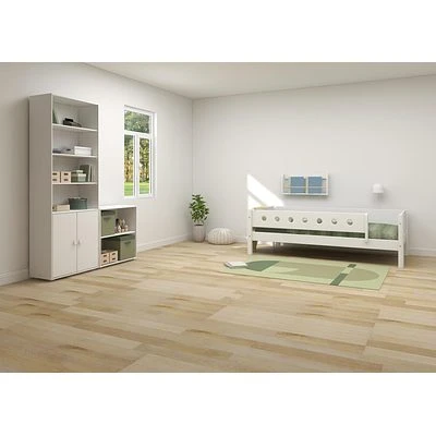 Das freistehende Roomie Maxi Bücherregal hat fünf Regalböden und zwei Türen und ist aus zertifiziertem MDF und HDF gefertigt. Das Bücherregal hat ein zeitloses skandinavisches Design mit glatten Kanten und Soft-Close-Funktion, damit kleine Finger beim Öffnen und Schließen der Türen nicht eingeklemmt werden. Es ist mit vier verstellbaren Regalböden und abgerundeten Holzknäufen in verschiedenen Farbvariationen erhältlich.