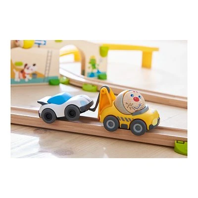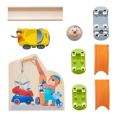 Für viel Abwechslung und Kreativität im Spiel sorgen die farbenfrohen Ergänzungs- und Themensets des Kullerbü-Spielsystems von HABA. So auch das Themenset Schrottplatz: Es enthält die kindgerecht gestaltete Kulisse Schrottplatz sowie den raffinierten gelben Abschleppwagen, der jedes Kullerbü-Fahrzeug an seinen Haken nehmen und abtransportieren kann. Ebenfalls mit dabei für extra großes Kullervergnügen: die Kugel Abschleppmeister Anton. Verbindungselemente geben dem Themenset einen sicheren Stand und versprechen ungetrübtes Fahr- und Spielvergnügen. Das hübsche Kullerbü – Themenset Schrottplatz von HABA ist mit jeder Kullerbü-Spielbahn kombinierbar und begeistert Kinder zwischen 2 und 8 Jahren.