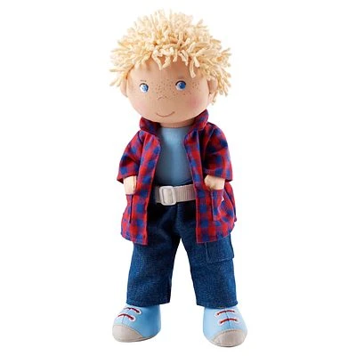 Der kleine Nick ist ein echter Wirbelwind. Er liebt es zu toben und kann prima schwimmen und Fußball spielen. Mit seinem süßen, aufgestickten Gesicht und den coolen Klamotten muss man ihn einfach lieb haben. Dank weicher Füllung eignet sich Nick auch prima zum Kuscheln und Schmusen. Hemd und Hose lassen sich einfach an und ausziehen, sodass Nick auch mal in andere Klamotten schlüpfen kann. Wie die anderen 30 cm HABA-Stoffpuppen ist Puppe Nick aus hochwertigen, pflegeleichten Materialien gefertigt und bei 30° waschbar.