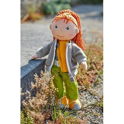 - Die Stoffpuppe ist 30 cm groß, träg eine grüne Cargohose, eine kuschelige Fleecejacke, Schal, Shirt und sonnengelbe Schnürschuhe