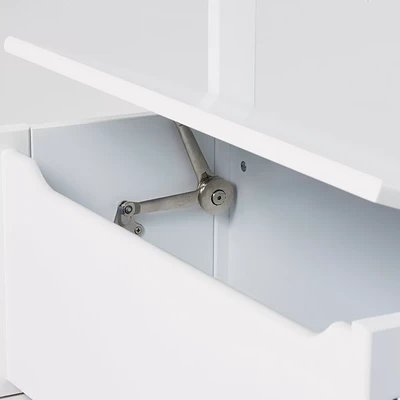 - Die Bank hat eine Ablage und eine von einem hudraulischen Arm getragene Platte. Dadurch wird verhindert, dass sich der Deckel versehentlich schließt und möglicherweise kleine Finger einklemmt. Wenn der Deckel vollständig geöffnet wird, hilft der hydraulische Arm dabei, ihn offen zu halten.