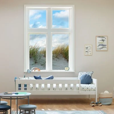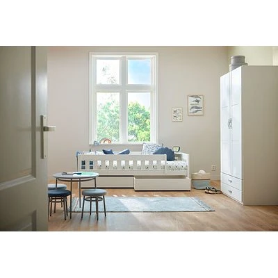 Das Lifetime Norden Basisbett mit Absturzsicherung ist ein hochwertiges und stabiles Bett aus massiver Kiefer und hochwertigen MDF-Komponenten. Das Bett wird in Dänemark hergestellt und besticht durch sein nordisches Flair und die charakteristische Sprossenfüllung. Die Absturzsicherung gibt Eltern ein sicheres Gefühl, während ihre Kleinen in ihrem neuen Bett schlafen. Das Bett bietet zudem ausreichend Platz für ein 90x200cm Matratze und beinhaltet bereits ein Rollrost mit formgespannten Latten. Die Verbindungsbeschläge sind kraftschlüssig und stabil, so dass das Bett immer wieder festgezogen werden kann. Das Lifetime Norden Basisbett kann mit allen Zubehör und Erweiterungen der Lifetime Produktpalette erweitert werden. Damit erhalten Sie zum Beispiel mit der großen Bettschublade jede Menge Stauraum für das Kinderzimmer. Das Bett ist in der Farbe Weiß erhältlich und kann perfekt mit anderen Möbeln der Norden-Serie kombiniert werden, um ein harmonisches und stilvolles Ambiente im Kinderzimmer zu schaffen.