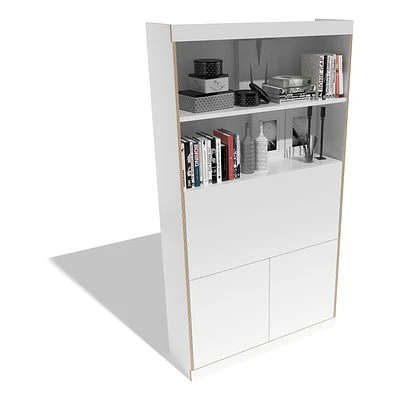 Mit FLAI HOME-OFFICE hat das Designer-Duo kaschkasch einen flexiblen Sekretär geschaffen, der mit seinem großzügigen Stauraum für Ordner, Technik oder Arbeitsmaterial ideal als Home-Office nutzbar ist. Die kleinere Variante des Sekretärs mit 1363 mm Höhe bietet einen flexibel unterteilbaren Unterschrank, in dem ein Drucker platziert werden kann. Im oberen Bereich steht zusätzlich Platz für einen Monitor zur Verfügung. Zusätzlichen Komfort ermöglichen die Push-to-open-Technik, der gedämpfte Klappenhalter, die eingebaute Beleuchtung und die Kabeldurchführungen. Die große FLAI-Variante mit 2168 mm Höhe bietet zusätzlichen Stauraum oberhalb des Arbeitsplatzes.