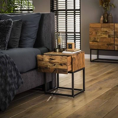 - Der Nachttisch ‚Mill‘ besteht aus sandgestrahltem Akazienholz in Kombination mit einem Metallgestell.