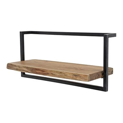 - Das Edge Wandregal besteht aus einer 61 cm breiten Akazienholzbohle, die an einem Rahmen aus schwarz pulverbeschichtetem Stahl befestigt ist.