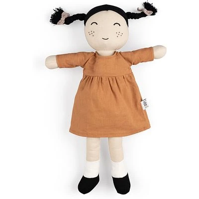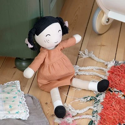 Diese Stoffpuppe trägt ein hübsches Kleid, welches das Kind beim Spielen an- und ausziehen kann, zudem ist sie mit süßen Sommersprossen auf den Wangen bestickt. Li lässt sich auch gut auf Ausflüge mitnehmen. Sie will immer gerne spielen und passt perfekt in das klassische Sebra-Puppenbett und den Kinderwagen. Wenn Li eine Spielpause einlegt, ist sie ein tolles Dekorationselement für das Kinderzimmer.