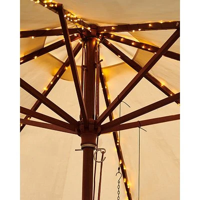 Schaffen Sie an späten Sommerabenden nachhaltige Gemütlichkeit am Gartentisch mit der neuen Solarkette zum montieren an Ihrem Sonnenschirms.