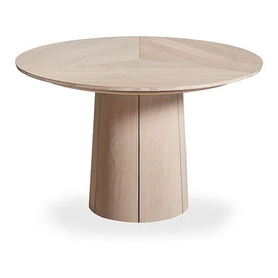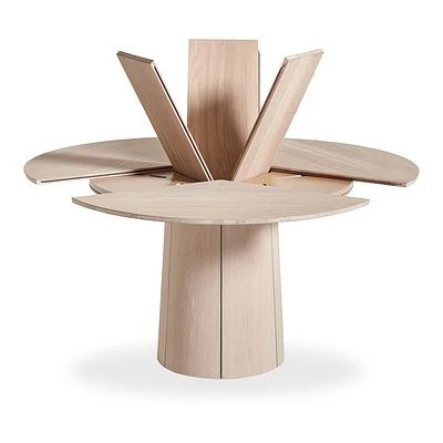 Der Esstisch Skovby #32 ist mit einem einzigartigen Verlängerungssystem ausgestattet. Durch Drehen des Drehtisches unter der Tischplatte bewegen sich die drei Flügel synchron in eine Position, die Platz für die Verlängerungsflügel im Sockel schafft. Bei leichtem Druck entfalten sich die Verlängerungsflügel mittels einer Feder, die unter dem Dreieck in der Mitte des Tisches angeordnet ist.