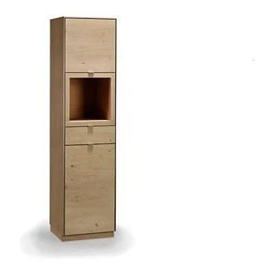 Skovby #914 Vitrine hat drei Holzregale hinter zwei Türen, ein offenes Fach, eine Schublade und LED-Licht. Die Verwendung von Aluminiumleisten an den Seitenkanten und speziell gestalteten Aluminiumgriffen verleihen dieser Vitrine einen einzigartigen Touch. Die Schränke haben ein geometrisches Aussehen.