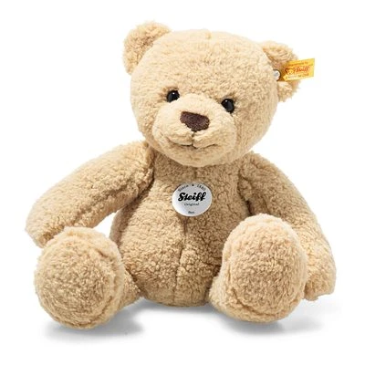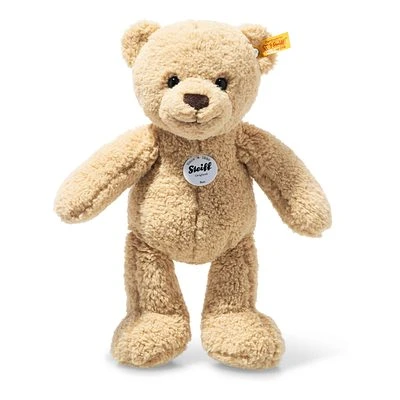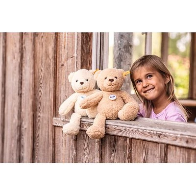 Der 30 cm große Ben Teddybär aus besonders kuschelweichem, beigefarbenem Teddyfleece ist ein aktiver, treuer Gefährte und als Mitglied der Steiff Bärenbande mächtig stolz auf seinen Ur-Ur-Ur-…Großvater 55 PB! Ben spielt am liebsten mit seiner Familie und ist dabei ständig in Bewegung. Charakteristische Mittelnähte, die gemütlich wirkende Gestalt und große, abgesetzte Tatzen zeichnen ihn ebenso aus wie sein pfiffiger Blick, das fröhliche Lachen, typische Teddybärenohren, die dunkelbraune Nase und der „Knopf im Ohr“-Klassiker aus Edelstahl!