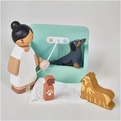 - Inhalt: 7 Hunde, ein Waschbereich mit Duschkopf und drei Handtüchern, ein Pflegetisch mit Bürste, eine selbststehende Rückwand mit steckbarem Haartrockner und Schermaschine, 3 Hundeprodukte in Flaschen und eine Siegertrophäe, 3 Podeste zum Ausstellen der frisierten Hunde, eine Decke, 2 Knochen in einer Schale und ein kleines Hundehäufchen!