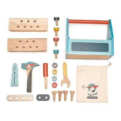 - Ein Werkzeugkasten mit Spechtmotiv der Marke Tender Leaf Toys, gefüllt mit allem, was du brauchst, um selbst etwas zu bauen.