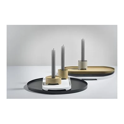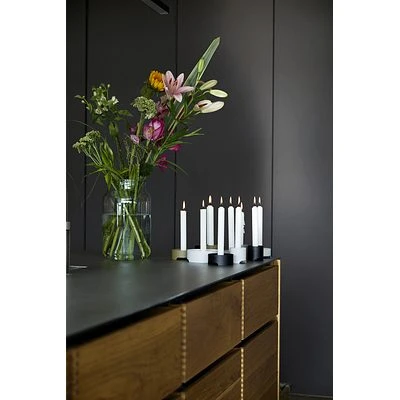 - Das matt lackierte Metall der Leuchter sorgt für Kontrast zum weichen Design, das tropfendes Stearin abfängt.
